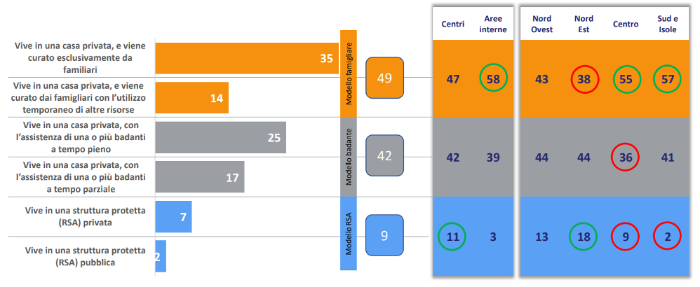 Un secondo elemento di rilievo riguarda il modello di assistenza individuando tre diversi “hub” di cura: le risorse familiari (il più diffuso), il ricovero in strutture residenziali (RSA) e, non da ultimo, la presenza di una badante valutando, su questa base, le diverse modalità di accesso e di utilizzo di altri servizi di welfare più marcatamente specialistici (in particolare di prestazioni sanitarie).