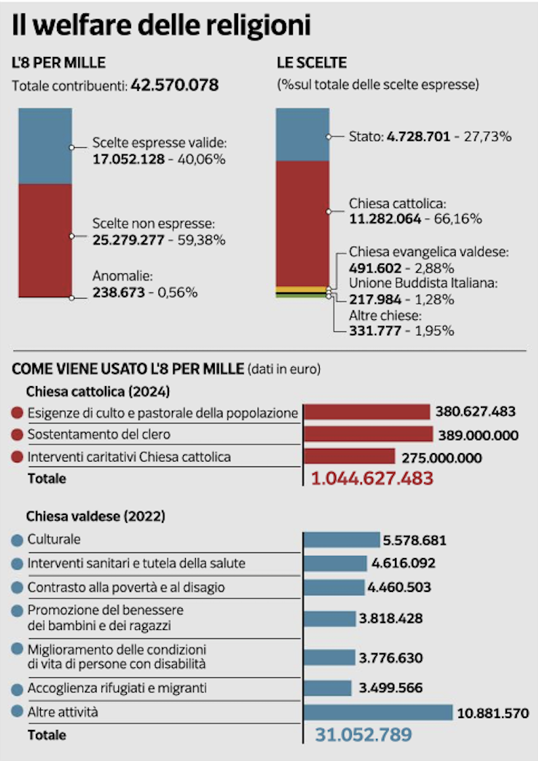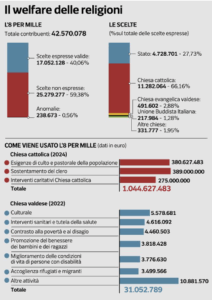 Nonostante il calo generalizzato della pratica religiosa, in Italia gli enti confessionali si confermano attori importanti che contribuiscono a fronteggiare i rischi sociali di persone e comunità. Un impegno reso possibile dai finanziamenti che provengono da donazioni, lasciti, attività economiche e contributi locali, ma anche e soprattutto dall’8 per mille, scelto da oltre 17 milioni di contribuenti attraverso la dichiarazione dei redditi.
