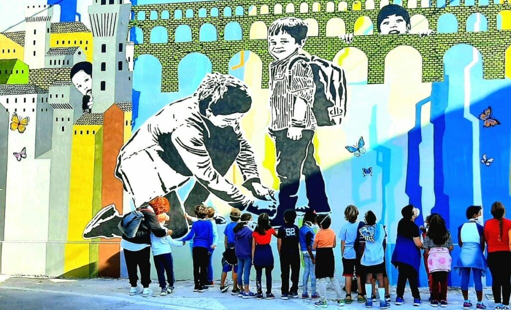 Nei primi giorni di ottobre sono stati inaugurati 140 murales che testimoniano le storie delle comunità che si prendono cura del bene comune, lasciando un segno sui loro territori. Gli autori di questo opere sono bambini, ragazzi, artisti, insegnanti, detenuti, persone con disabilità e migranti, che hanno partecipato a percorsi guidati per realizzare i vari murales reinterpretando in chiave personale uno stencil creato per l’occasione dallo street artist LDB, che raffigura una donna che allaccia le scarpe a un bambino sorridente.