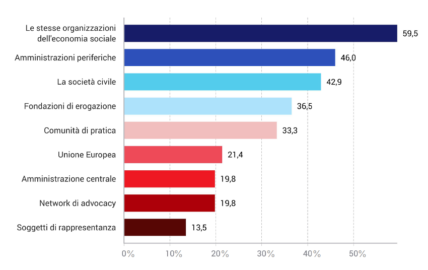 In un contesto di profonda crisi, le organizzazioni dell’economia sociale hanno iniziato a svolgere un ruolo fondamentale di complemento all’offerta di servizi di welfare da parte del settore pubblico. La numerosità delle organizzazioni, la loro capillarità e la capacità di risposta spesso più rapida e flessibile rispetto a quella del soggetto pubblico, sottoposto a vincoli e procedure più stringenti, ha reso le stesse attori centrali dell’offerta di welfare. La maggioranza degli esperti della expert survey sopra citata ritiene che il welfare pubblico sia in grado soltanto in parte di rispondere ai bisogni sociali, e che quindi le organizzazioni dell’economia sociale possano fungere da supporto, confermando l’idea che l’economia sociale non è più vista come marginale o emergenziale, ma come parte integrante dell’architettura dei servizi di welfare. Tale centralità si rileva soprattutto a livello locale, dove l’offerta di servizi ha subito un ripensamento alla luce dello sviluppo di dinamiche collaborative tra attori. Sono proprio le amministrazioni periferiche, al di là delle stesse organizzazioni, che secondo gli esperti possono favorire lo sviluppo dell’economia sociale, molto più che l’amministrazione centrale o l’Unione Europea (Figura 2).