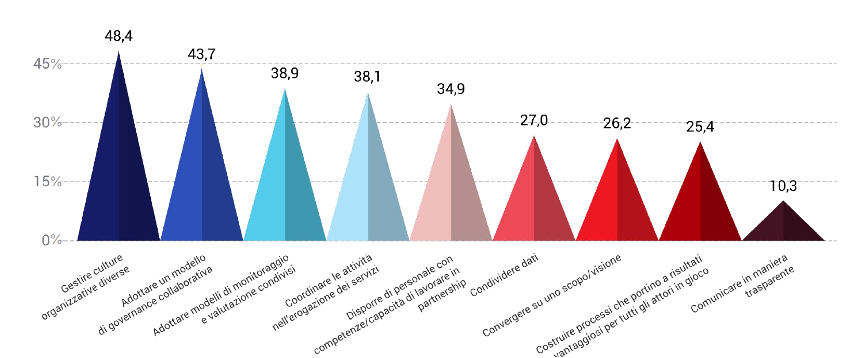 In questo contesto, il settore pubblico resta il coordinatore dei vari soggetti che partecipano al sistema di offerta di servizi, in una logica di sviluppo socioeconomico inclusivo. Se il ruolo del settore pubblico è centrale per garantire stabilità, scalabilità e coordinamento delle esperienze, la sfida è, per le stesse organizzazioni dell’economia sociale, quella di non percepirsi più come organismi operativi nella fornitura di servizi commissionati e decisi dal settore pubblico, ma assumersi la responsabilità di collaborare nel disegno dei servizi attraverso un processo di intercettazione dei bisogni della comunità. Tuttavia, le stesse organizzazioni dell’economia sociale non si dimostrano sempre in grado di operare questo salto, soprattutto a causa di elementi interni, legati alla gestione delle culture organizzative diverse e all’adozione di modelli e processi collaborativi e condivisi, che costituiscono le principali difficoltà che le organizzazioni incontrano quando collaborano tra loro nell’ambito del welfare (Figura 3).